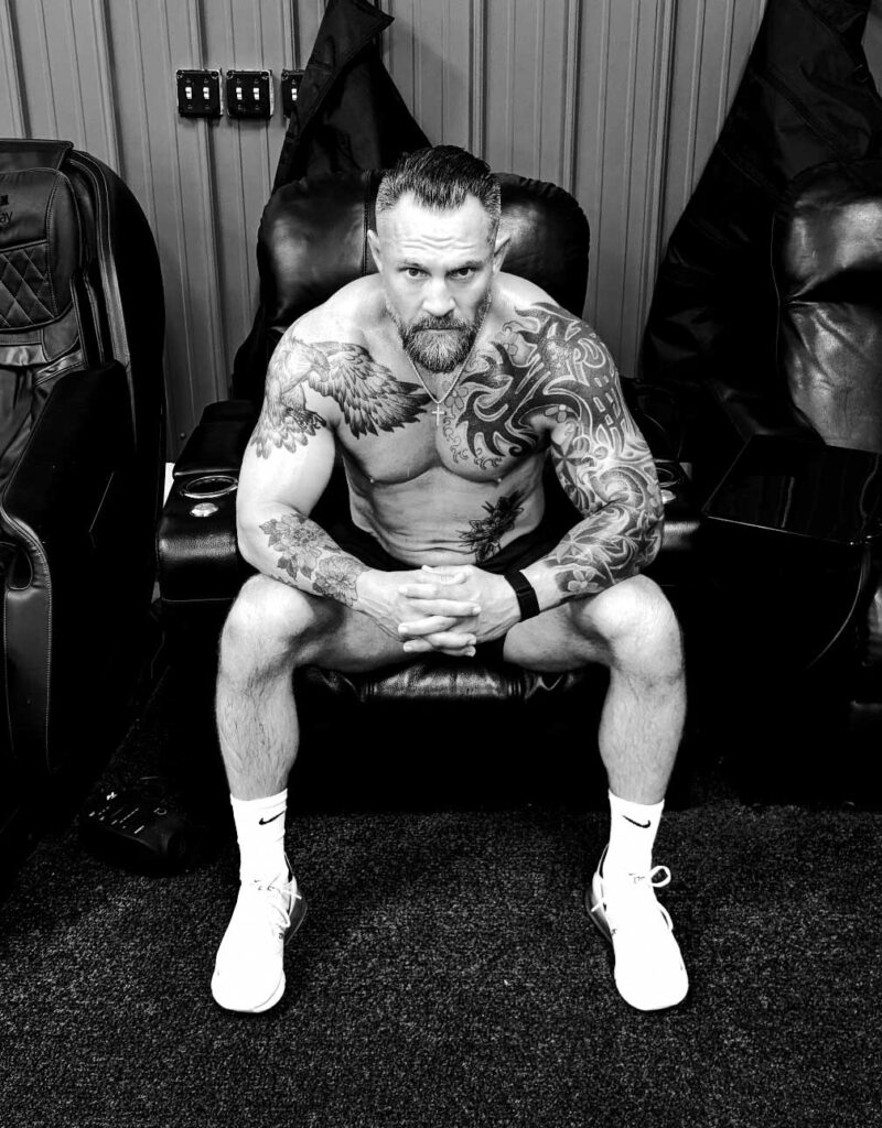 Tattoos, muscles, and a beard, but calm, grounded delivery instead of loud hype.